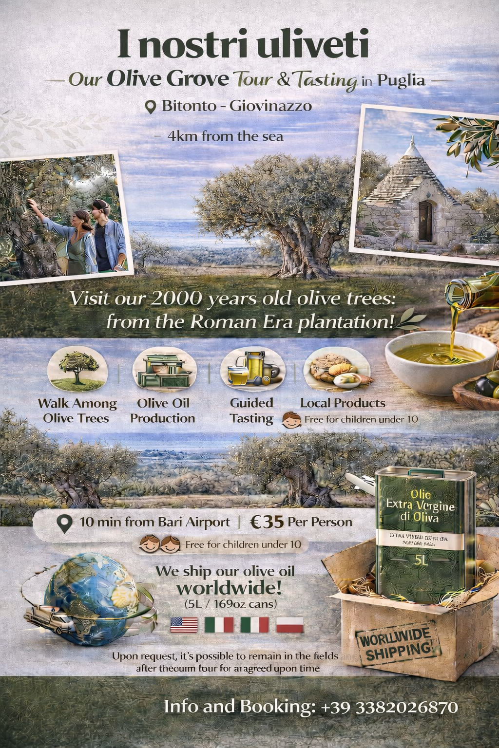 During your stay, if you’d like to enjoy a truly authentic experience, we organize an exclusive olive grove tour in our family fields between Bitonto and Giovinazzo, 4 km from the sea 🌿